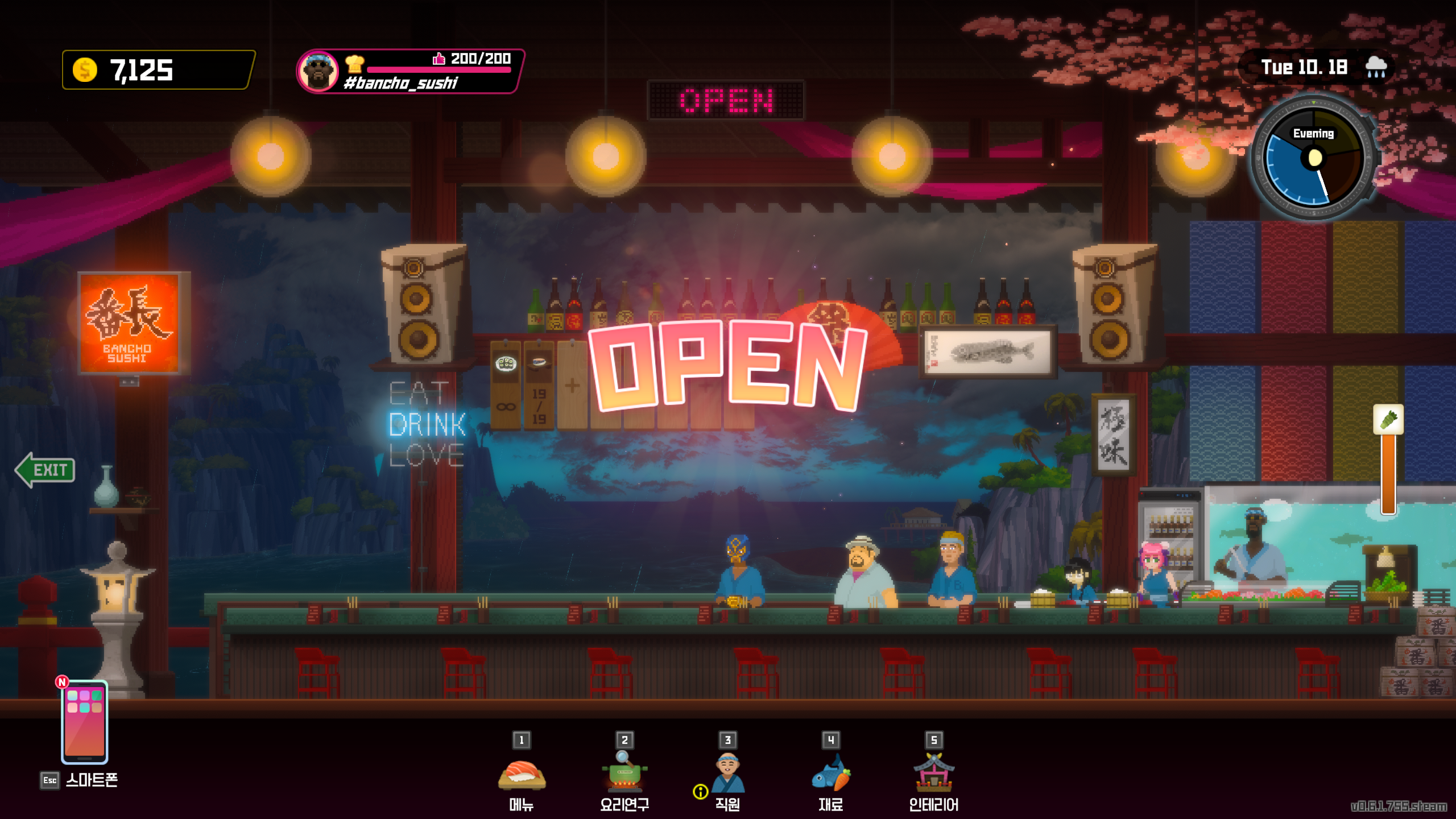 밤에는 수집한 재료들을 바탕으로 스시집을 운영하여 재화를 수급할 수 있다.