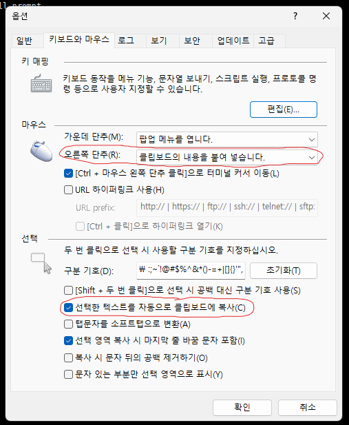 최초에 XShell을 설치하고 사용하게 된다면 Super PuTTy나 다른 가상머신 터미널에서 기본적으로 제공하는 마우스 드래그 & 우클릭 기능이 동작하지 않는다.
