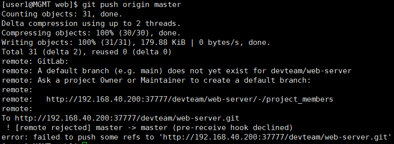 remote: GitLab: You are not allowed to push code to protected branches on this project. To http://192.168.40.200:37777/devteam/web-server.git