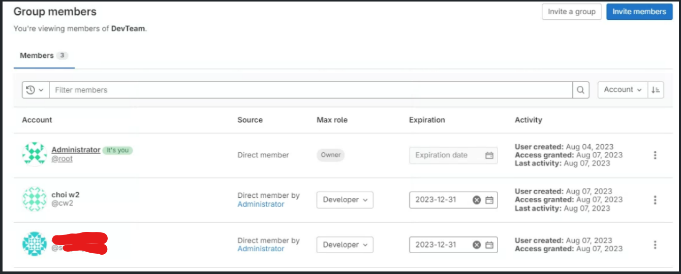 본인은 개발자 팀원이 가입한 계정을 승인한 후 그룹을 만들어 DevTeam 그룹에 사용자들을 포함시켰다.