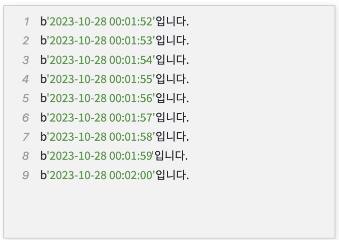 즉, 현재 시간을 변수로 담아서 스트림 데이터로 전달하기 때문에, 해당 변수 부분은 UTF-8로 인코딩된 데이터라는 의미이다. 변수를 따로 디코딩하지 않고 전달하면 바이트 형태로 전달된다.