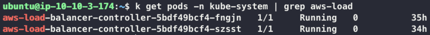 최종적으로 AWS LB Controller가 구성되고 나면 2개의 파드가 kube-system 네임스페이스에서 동작한다.