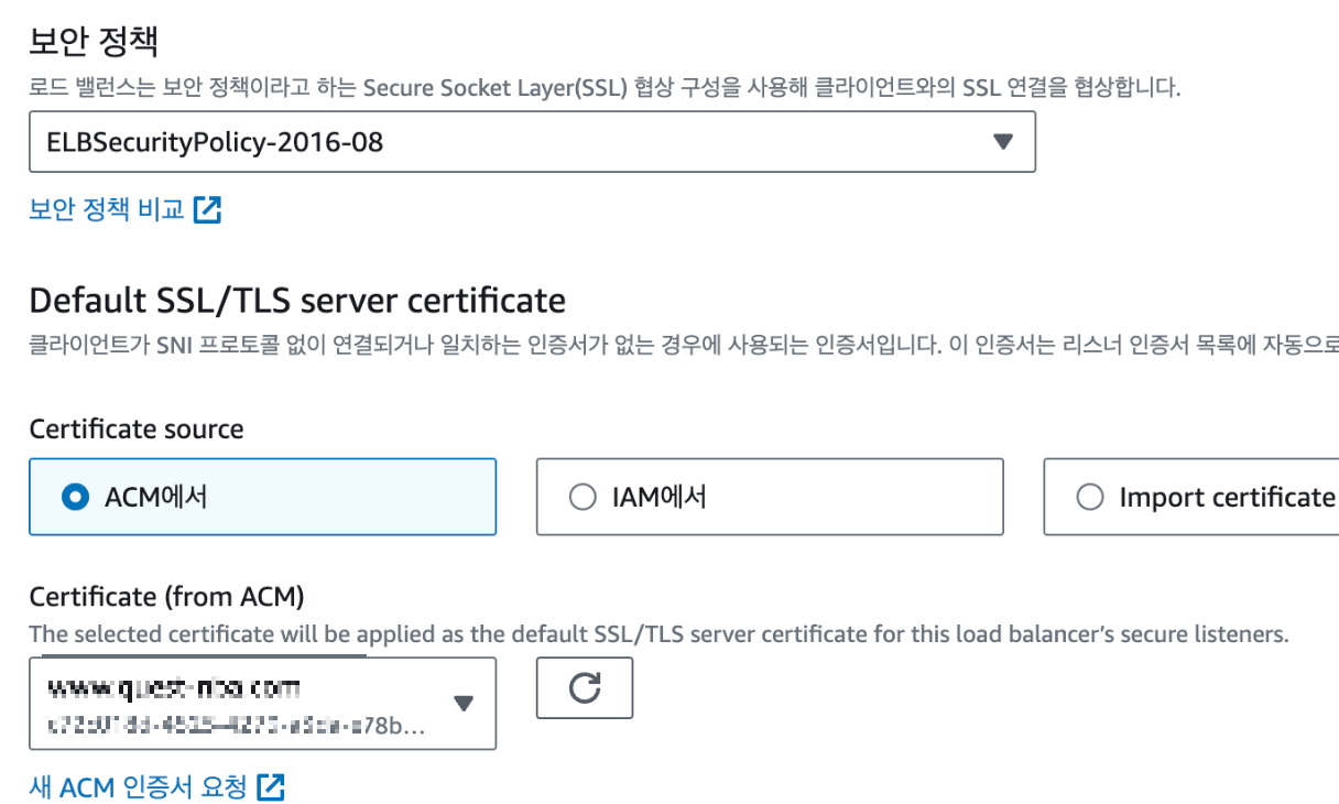 리스너를 편집해서 프로토콜을 HTTPS로 올리면, 아래에 보안 리스너 설정 항목에서 보안 정책 및 SSL/TLS 인증서를 선택하는 과정이 생긴다.