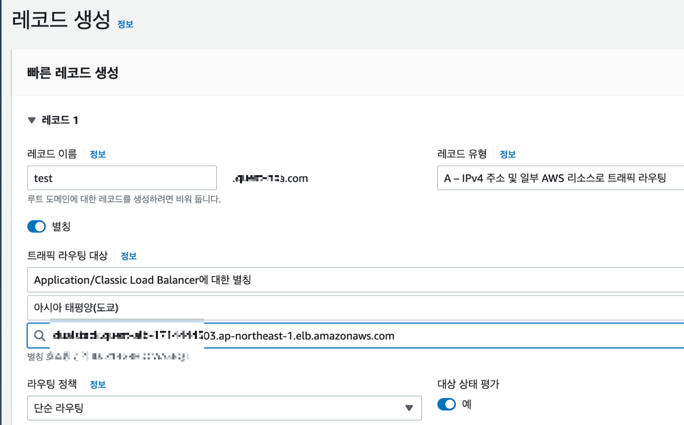 Route53 > 호스팅 영역 > 레코드 생성 을 통해, 아래처럼 "별칭"을 통해 구성한 ALB를 잡아주면 모든 구성이 완료된다.