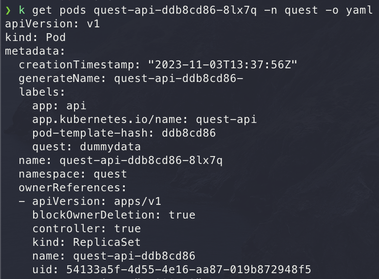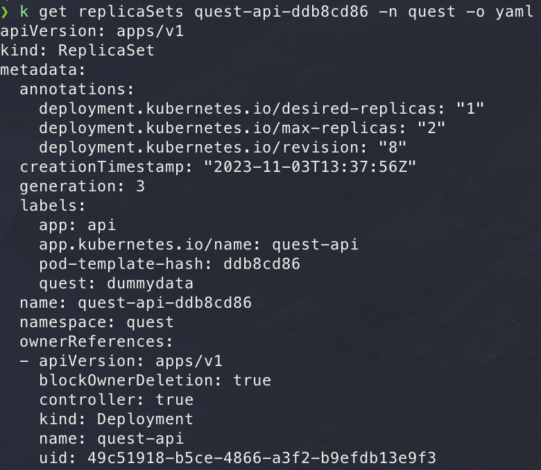 실제로, Pod의 Onwer(ReplicaSet)의 name과 uid가 확인되고 blockOwnerDeletion 필드로 추가되어 있음을 확인할 수 있었다.