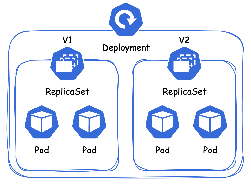 아래는 해당 Object들의 관계이다. 이를 직접 동작하고 있는 Deployment에 대하여 Pod와 ReplicaSet의 상세 정보를 확인하고자 한다.