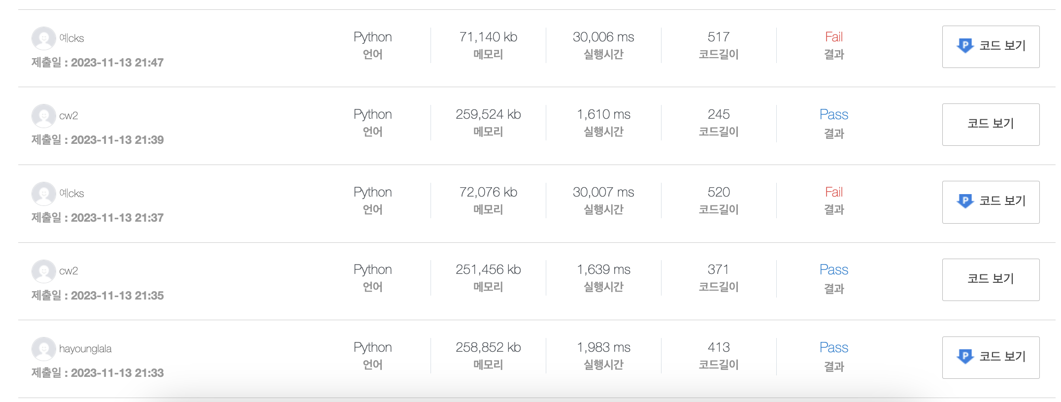 다만, 사용 메모리 부분은 다른 사람들은 앞자리가 다르던데, 공간 복잡도는 아직 잘 고려하진 못하는 것 같다.