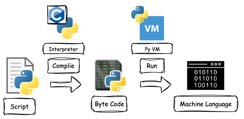 Python은 소스 코드를 바이트 코드로 컴파일한 후 Python VM에서 시스템에 맞게 바이트 코드를 해석해서 실행된다. 이 과정에서 Python은 별도의 실행 파일을 생성하지 않고, 소스 코드를 한줄씩 읽어들여 실행한다.