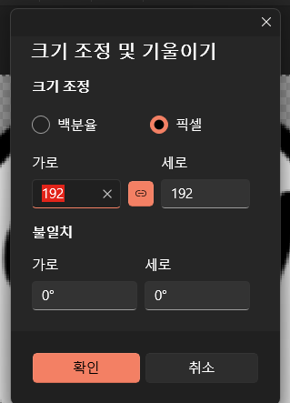 본인은 192 x 192 px로 비율이 일정하지만, 만약 파비콘 원본 사진의 비율이 일정하지 않다면 중간의 버튼을 클릭하여 비율 고정을 제거해야한다.