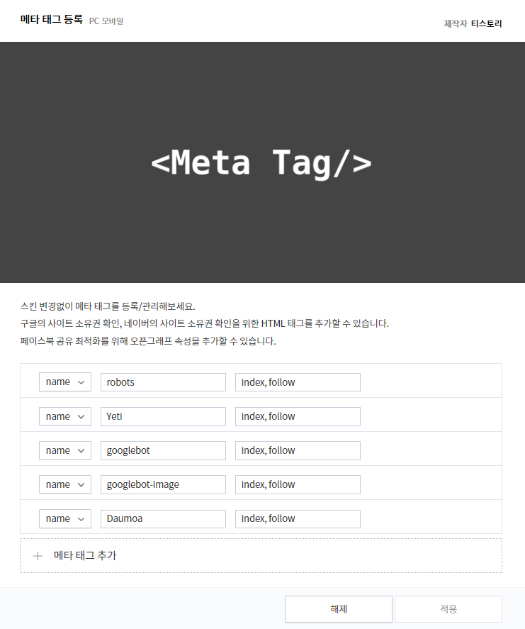 메타 태그를 추가하기 위해선, 티스토리의 메타 태그 등록 플러그인을 사용할 수 있다.