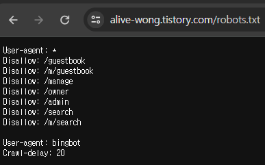 하지만, 티스토리의 경우 직접 robots.txt를 수정하거나 올릴 수 없게 되어있다.