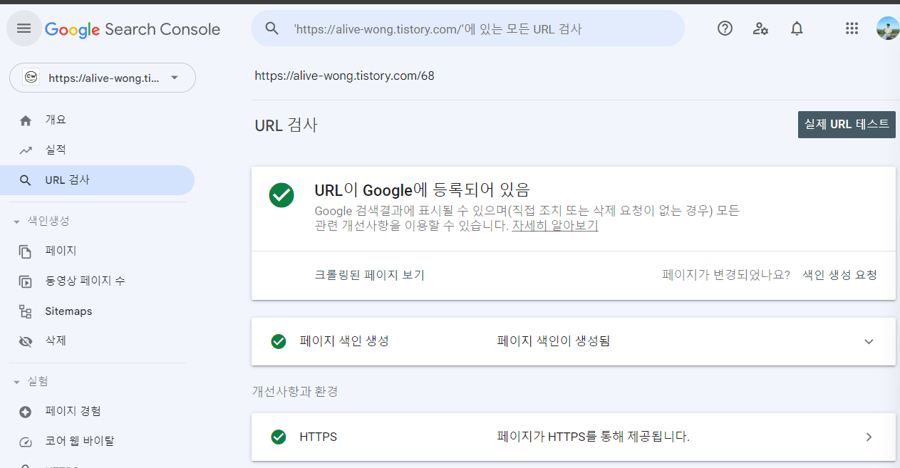 URL 검사 페이지로 넘어가고, 이미 URL이 등록되어 있음을 알 수 있다(처음 등록하면 아닐 수도 있음).