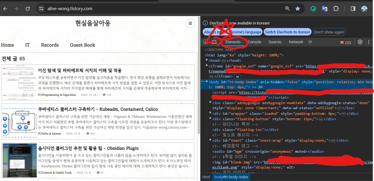 이를 확인해보고 싶으면, 본인의 블로그 페이지에 들어가서 개발자 도구를 열어보면 된다. 크롬 브라우저에선 F12 버튼을 눌러 확인할 수 있다.