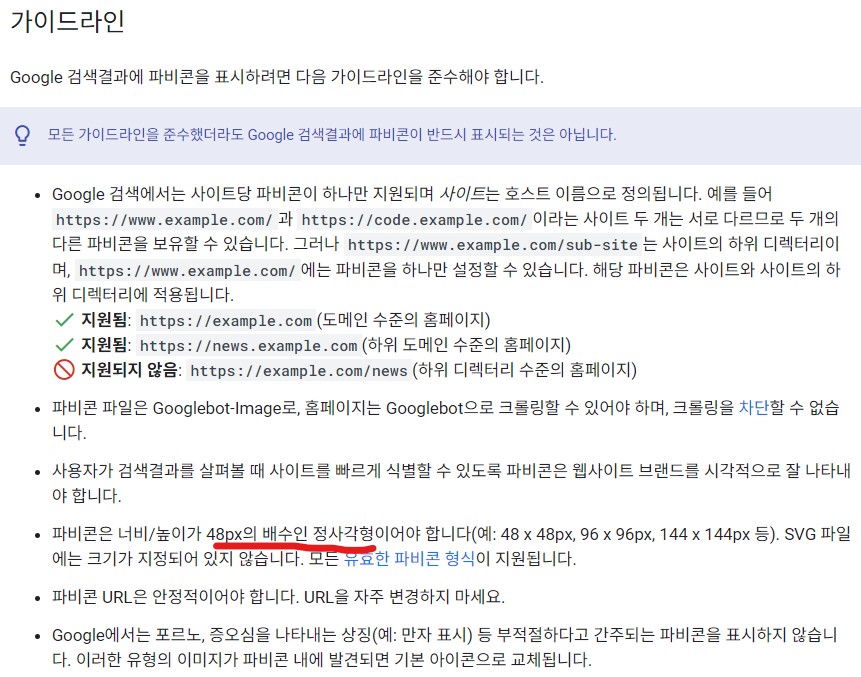 해당 가이드라인 중에서 본인이 준수되지 않았던 점은 파비콘이 48 x 48px 크기가 아니였다는 점이다.
