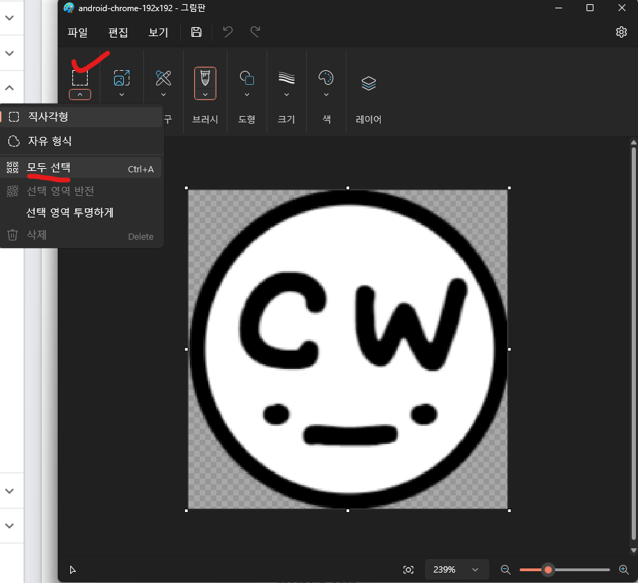 그림판에서 사진을 불러온 후 위 사진의 버튼을 눌러 모두 선택하기를 누른다.