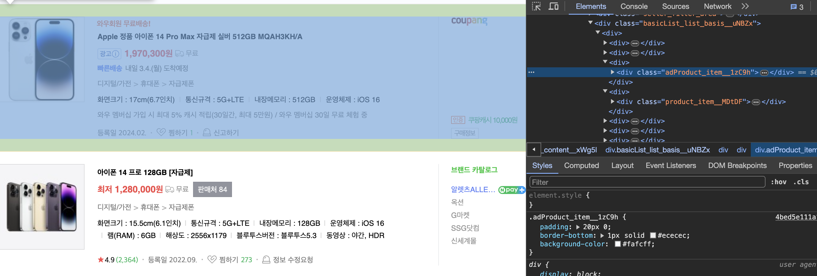 - 쇼핑 페이지에서 첫 번째 페이지의 모든 아이템에 대해 크롤링을 진행한다.