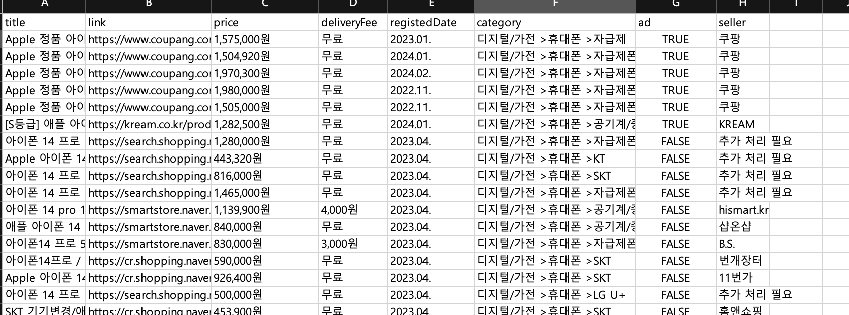 - 별도의 엑셀 파일에 수집할 쿼리를 담고, 해당 엑셀 파일명을 매개변수로 지정하여 쿼리별 200개의 아이템이 담긴 엑셀 파일이 반환되도록 한다.