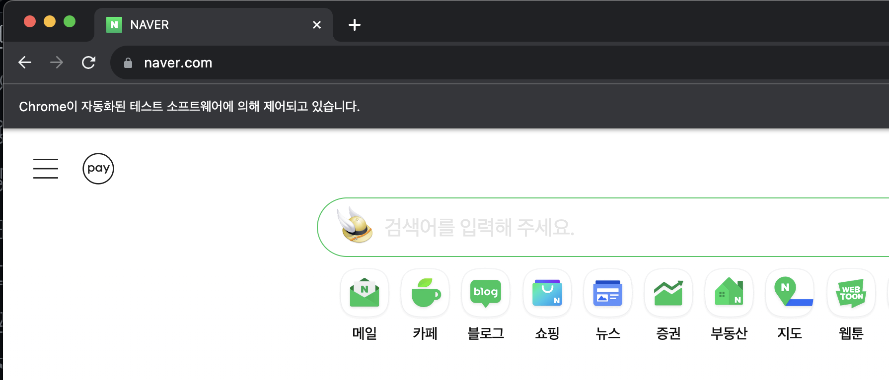 아래는 Selenuim을 통해 네이버 메인 홈페이지에 접속하는 테스트 코드이다.