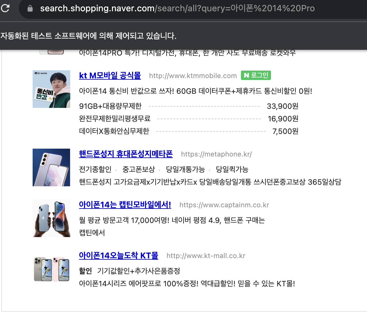 - Selenuim을 사용하기 위한 환경 설정 및 기본 사용법 대해 이해한 후, Python 리스트로 5개의 쿼리를 임의로 선언여 네이버 메인 페이지로부터 쇼핑 페이지에서 해당 쿼리로 검색한 페이지를 반환하도록 한다.