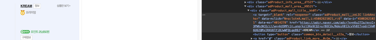 네이버 쇼핑에 존재하는 상품 링크는 네이버 자체 페이지이다. 즉, 실제 판매자의 링크가 아니라는 점을 확인할 수 있었다.
