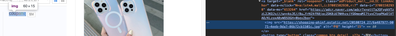 크롬 브라우저의 개발자 도구를 사용하여 쇼핑 탭의 버튼의 속성을 파악하면 아래와 같다.