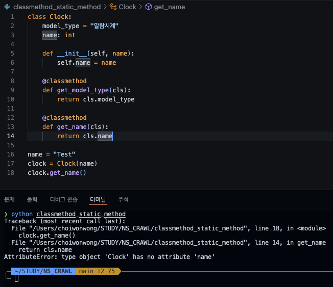 이렇게 코드를 짜고 돌려보면, `AttributeError: type object 'Clock' has no attribute 'name'` 에러를 반환환다.