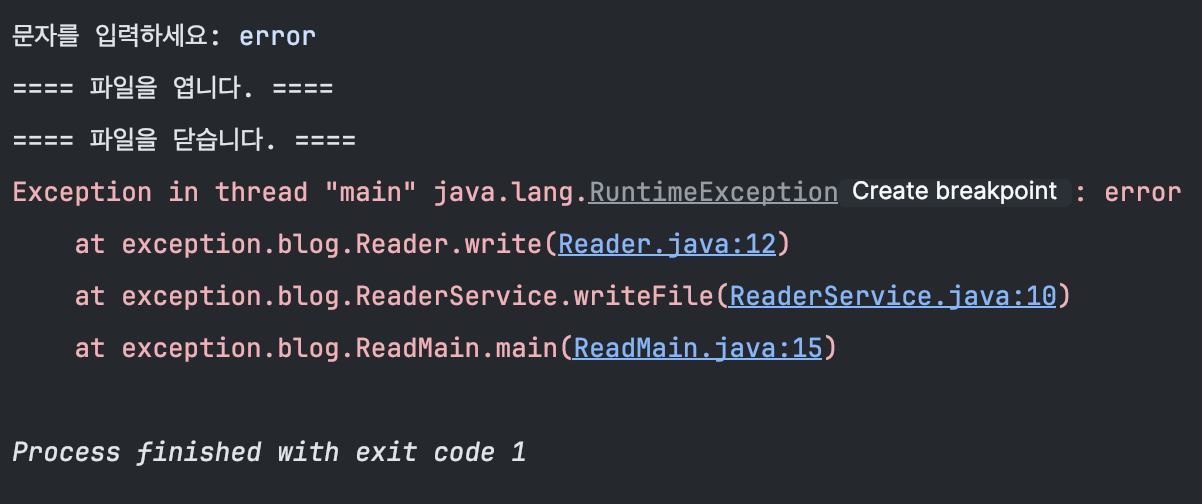 위 결과를 확인해보면, reader.close()가 실행되는 시점(실제로 파일을 닫는 시점)은 catch에서 처리가 되고 난 후이다.