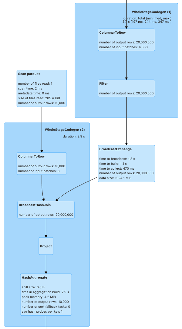 이 과정에서 별도의 셔플이 발생하지 않는 것을 확인할 수 있었다. 즉, spark가 알아서 작은 데이터셋을 확인 한 후 Broadcast Hash Join 전략을 사용해 조인을 수행했다.