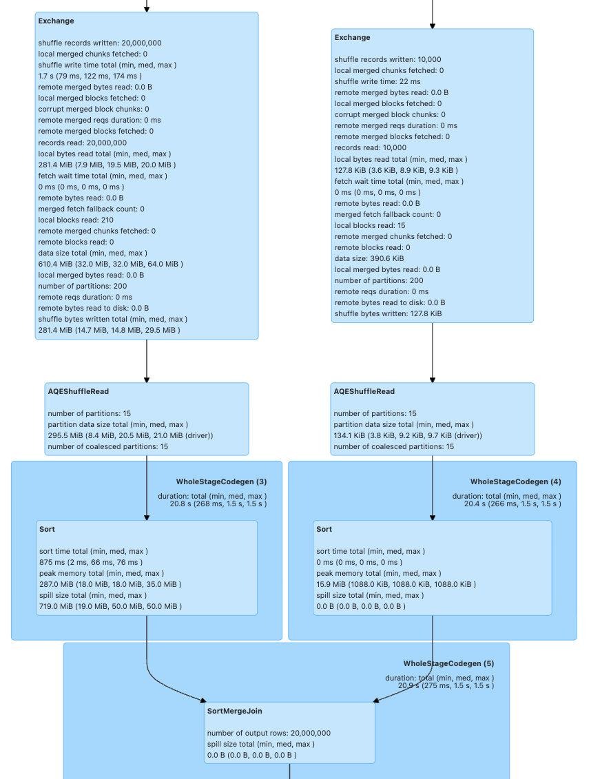 - 양쪽 테이블 모두 브로드캐스트 임계값(10MB)을 초과하면 SortMergeJoin이 선택된다.