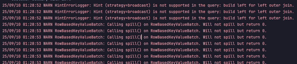 다만, 위 코드를 broadcast(customer_df).join(orders_df) 방식으로 변경하고 실행해보면 다음과 같은 경고를 확인할 수 있고, BroadcastHashJoin으로 수행되지 않는 것을 확인할 수 있었다.